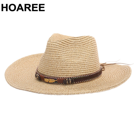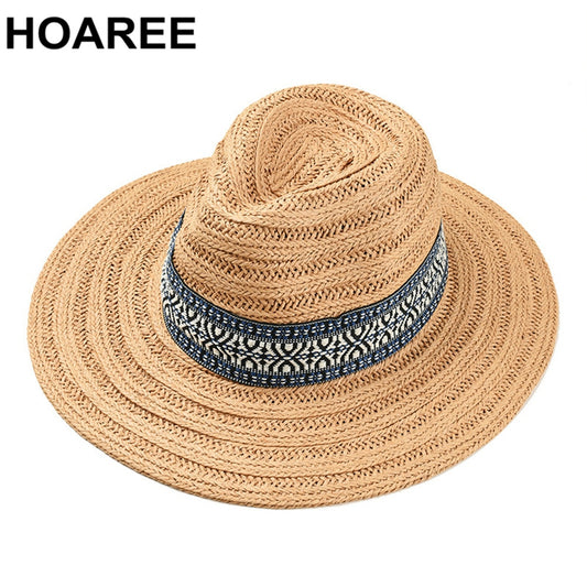 HOAREE Handmade Summer Hats Women Sun Straw Hat Men Fedora Khaki Ethnic Breathable Outdoor UV Protection Jazz Sunshade Hat
