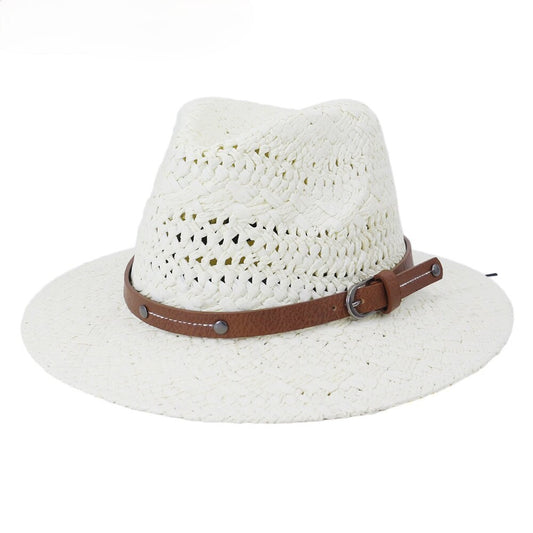 Women Straw Summer Hats Wide Brim Beach Hat Sombrero Men Fedora Sun Visor Belt Decoration Khaki Jazz Sun Hat