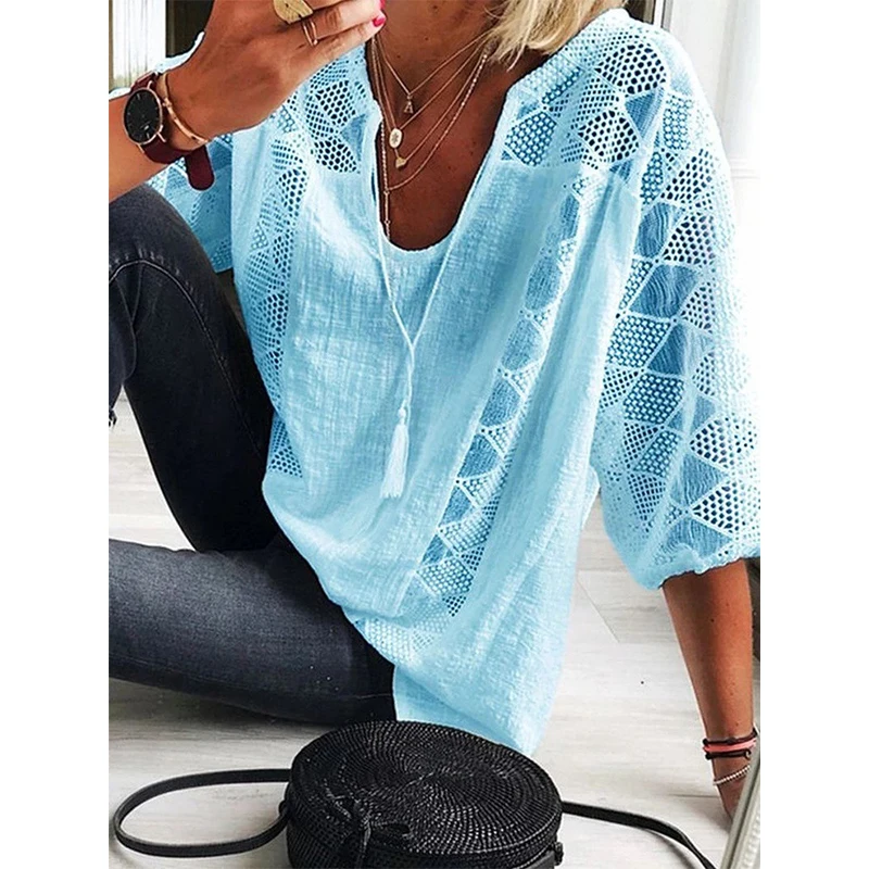 Summer V-neck Lace Cotton Linen Shirt Spring Three Quarter Sleeve Plus Size Blouse Casual Patchwork Women Tops and Blouses