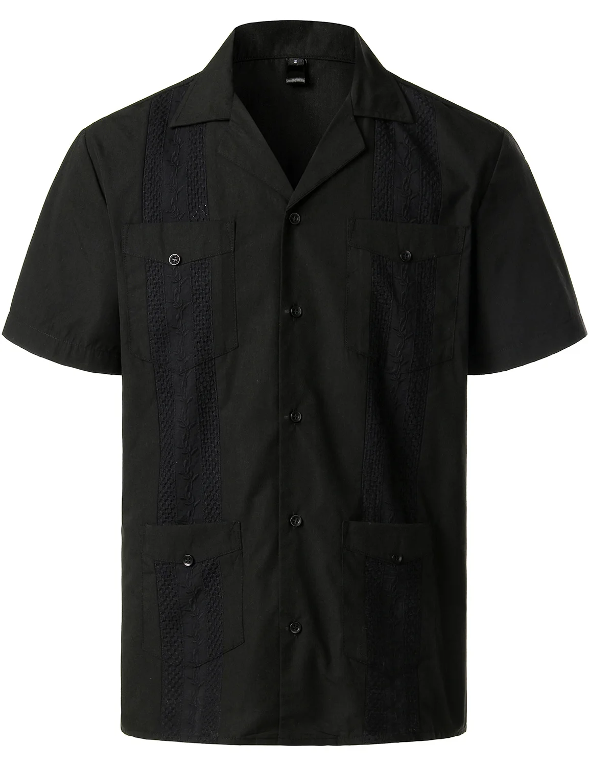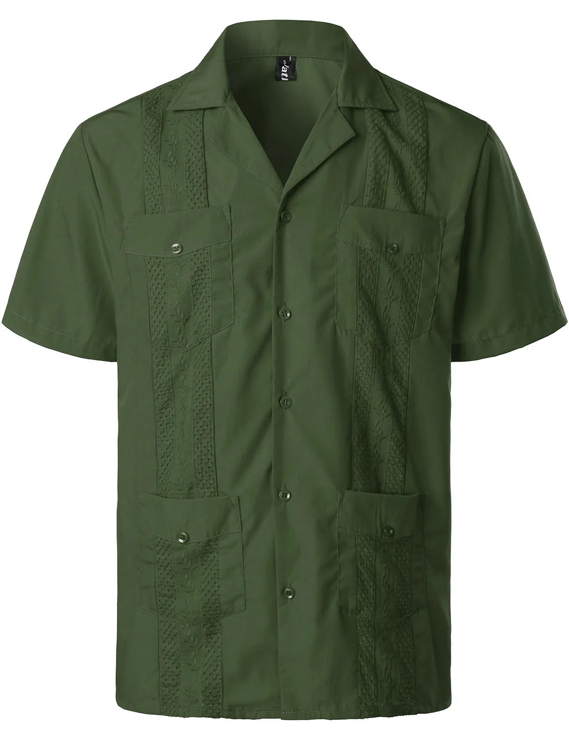 Army Green Mens Four-Pocket Guayabera Shirt Short Sleeve Cuban Camp Collar Shirts Men Embroidered Wedding Mexican Beach Shirt